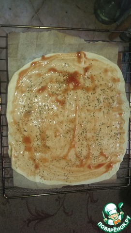 • Смазываем тесто оливковым маслом, посыпаем Итальянскими травами, смазываем томатным соусом (соуса можно больше, чем на картинке)
