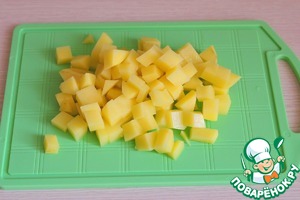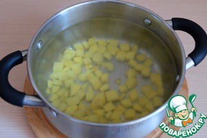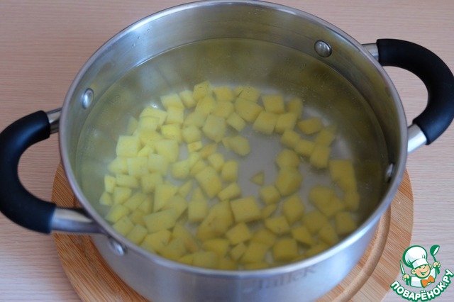 В кастрюлю добавить воду. Дать закипеть, затем добавить порезанный кубиками картофель. Варить 3-4 мин.
