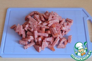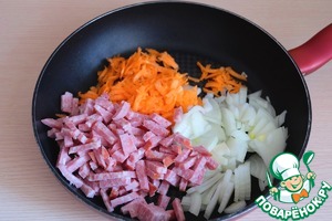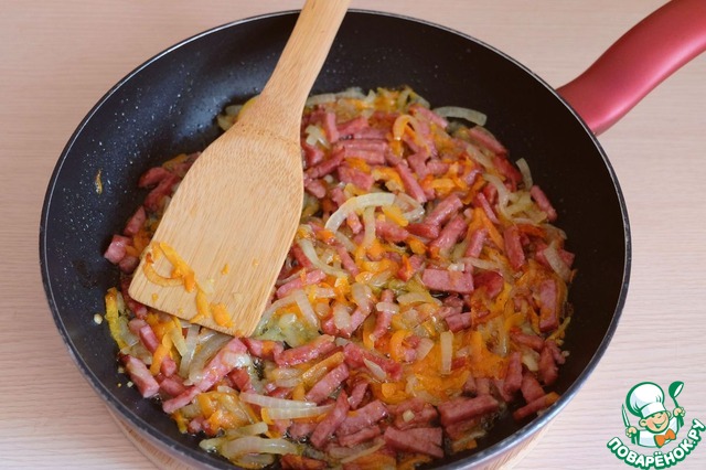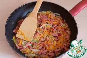 Пассеровать овощи и брусочки колбасы до легкой золотистой корочки.