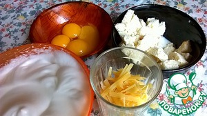 Спустя пять минут хорошо перемешать вилкой набухший хлеб, добавить в него желтки и сыр (оставить немного для посыпки), посолить. Количество соли зависит от солёности сыра. Тщательно перемешать и аккуратно в несколько приёмов ввести белки.