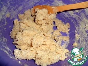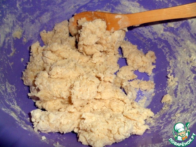 Вынув из пакета тесто, его нужно немного подмесить на столе со столовой ложкой муки, в пакете оно дало испарение.