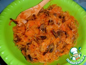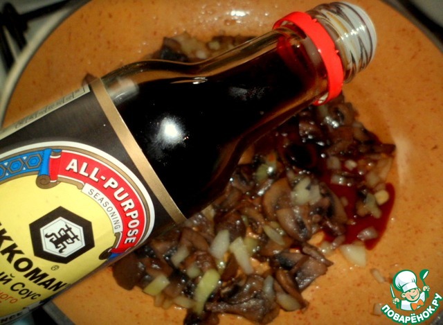Грибы нарезать мелко, нарезать мелко одну луковицу. Обжарить лук в 1 ст. л. масла, добавить к нему нарезанные грибы и влить столовую ложку соевого соуса. Помешивая, довести до готовности пару минут. Переложить в другую посуду.