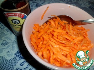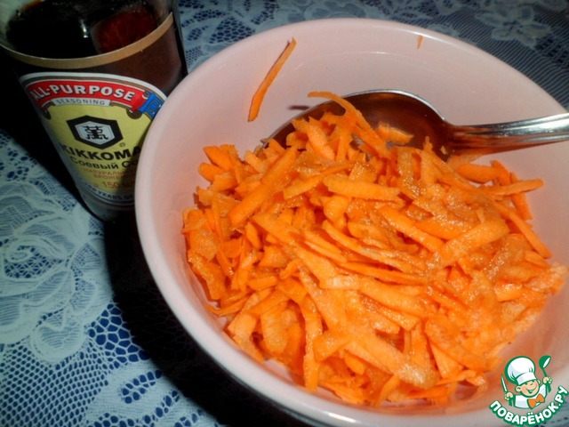 Натереть морковь и добавить к ней вторую ложку соевого соуса, перемешать.