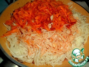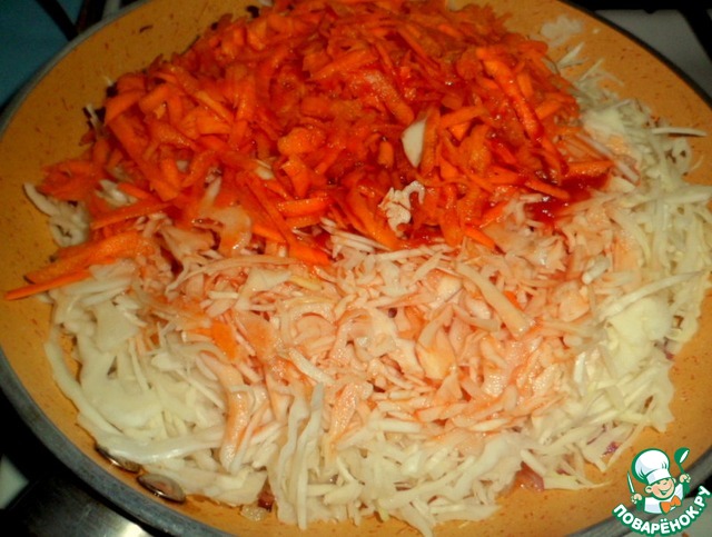 Нашинковать капусту и еще, немного, порубить её ножом. Нарезать мелко вторую луковицу, спассеровать в 2 ст. л. масла, Выкладываем к луку капусту, морковь и разведенную в 200мл кипяченой воды томатную пасту. Добавить соль, острый перец и лимонный сок, все подгоняем на свой вкус.