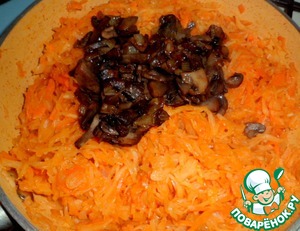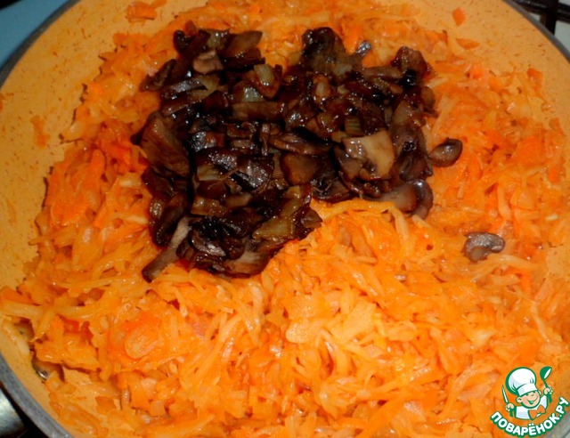 Добавляем грибы, все перемешиваем и даем соединиться под крышкой минуты две-три.