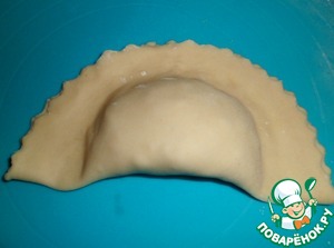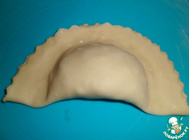 Складываем тесто пополам и прижимаем тесто пальцами, обмакнув их в муку, вплотную к начинке, края не трогаем.