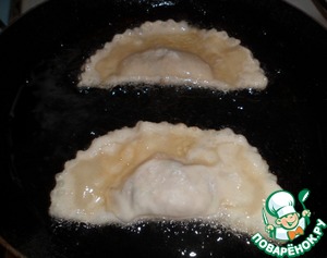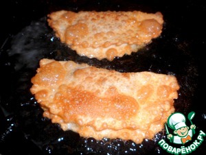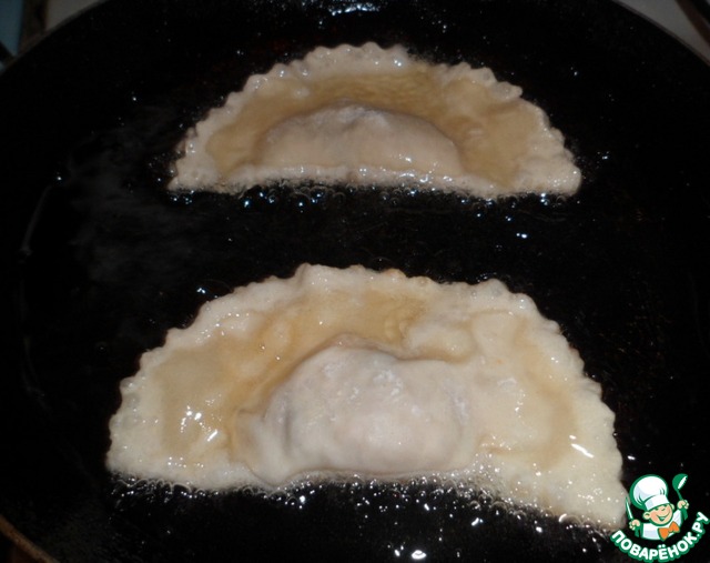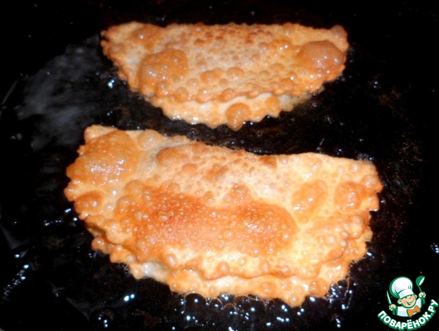Выкладываем чебуреки, обжариваем с одной стороны. -