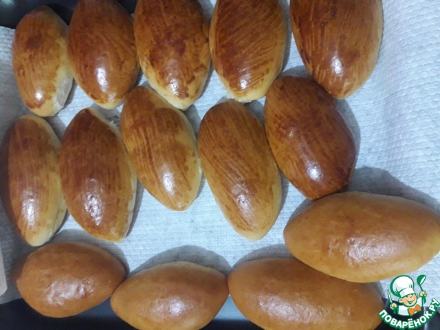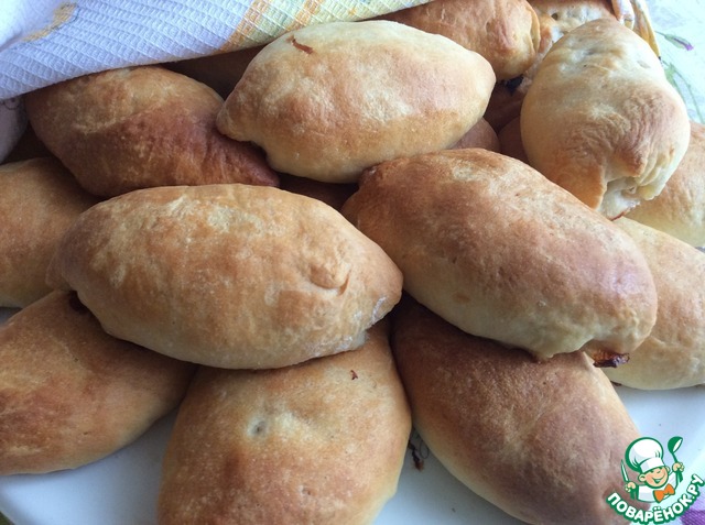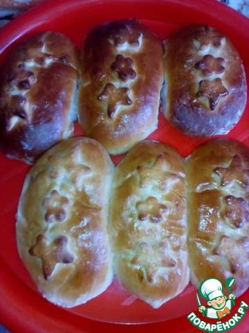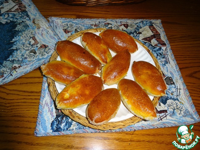 Венчиком слегка взбиваем яичный желток и смазываем поверхность пирожков. Оставляем на 15 минут и затем выпекаем в предварительно разогретой духовке 25 минут, при температуре 190-200 градусов.