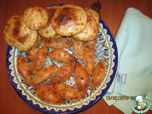 Стол присыпаем мукой, кладем тесто, обминаем его и делим на 20 одинаковых частей. Из каждой части раскатываем круглую лепешку, диаметром чуть больше 10 см, в серединку кладем 1 ст. л. начинки.
