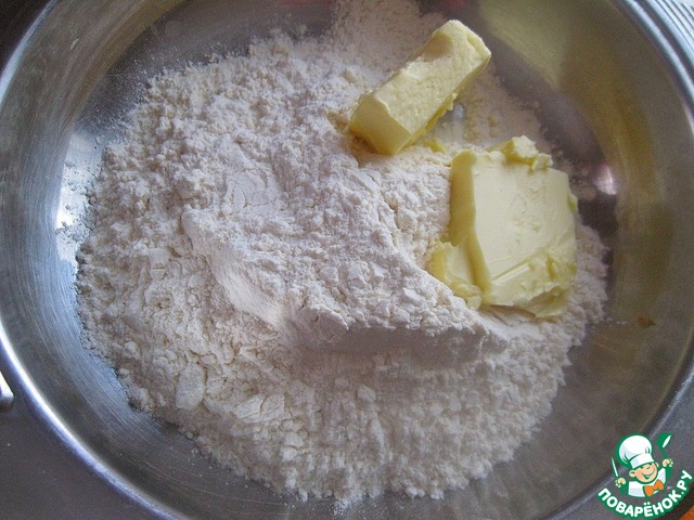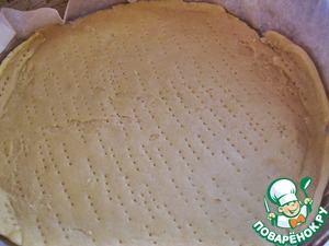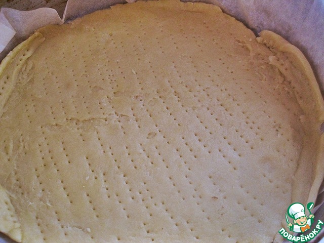 Достаем тесто из холодильника. Раскатываем в пласт и укладываем в форму постеленной бумагой для выпечки. Протыкаем его вилкой. Выпекаем в разогретой духовке 190* на 15 минут.