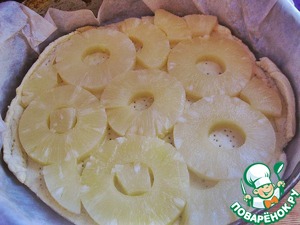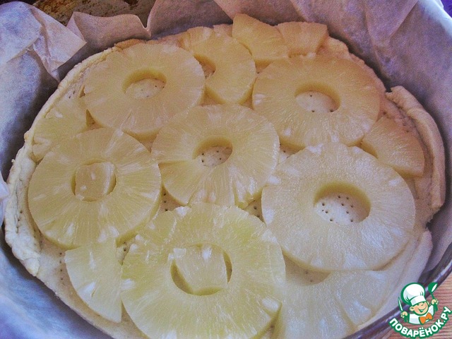 Затем обмазываем корж сметаной и выкладываем ананасы. Отправляем в духовку на 10 минут.