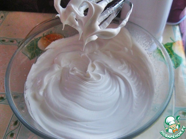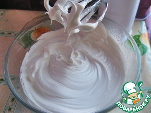 В это время делаем безе:взбиваем белки, постепенно добавляя сахар до твердых пиков.