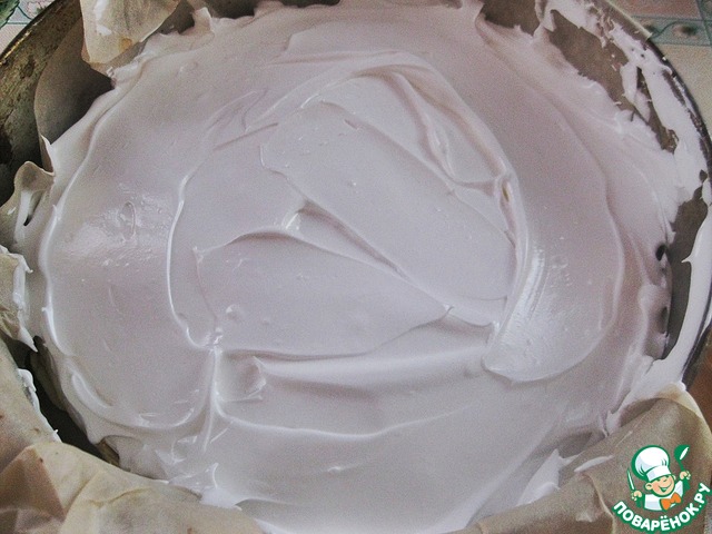 Выкладываем безе поверх пирога. Выпекаем до легкого румянца, примерно 10-15 минут. А по истечению времени даем остыть.