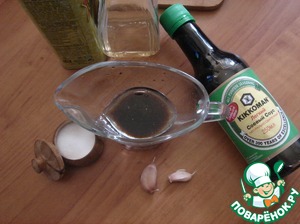 Делаем заправку. Смешиваем соевый соус, бальзамик (уксус) и оливковое масло. Добавляем щепотку соли.