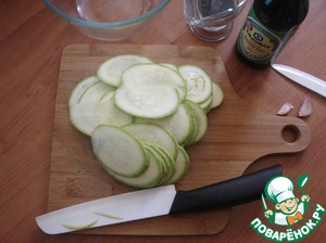 Кабачки тонко режем на "кругляши". Я воспользовалась керамическим ножом. Укладываем их в посуду. Немного присаливаем. Я опять щепоткой соли посолила.