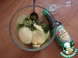 Отправляем зелень, чеснок к кабачку, выливаем заправку и перемешиваем. Вот и всё. Можно дать постоять, а можно сразу есть.