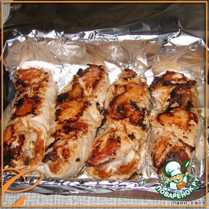 Укладываем рулетики, капаем немного водички, прикрываем второй частью фольги. запекаем минут 20-25 при 200 градусах.