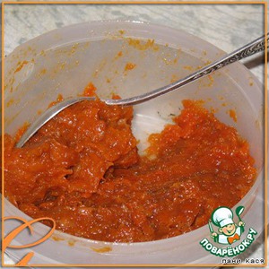 Измельчить курагу, можно добавить орешки, развести немного (я развела просто водой кипяченой, можно добавить лимонного сока).