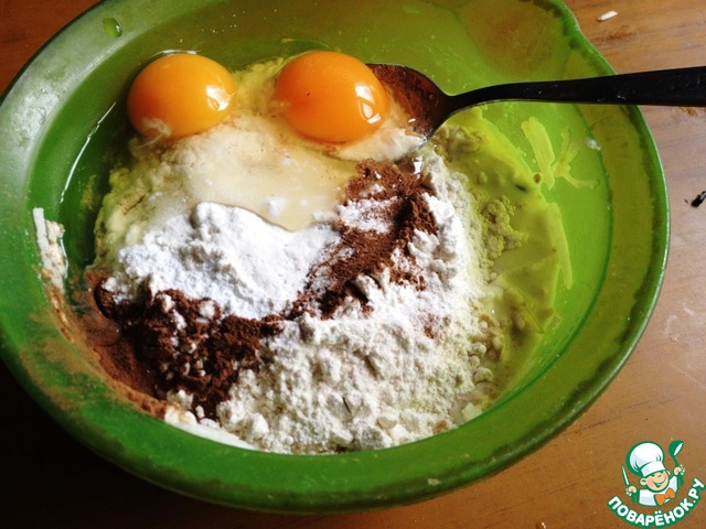 Добавить муку, просеянную с разрыхлителем, корицу, яйца. Хорошо перемешать.