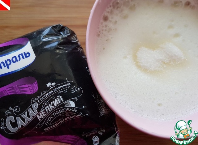 Яйца разделить на белки и желтки. Белки взбить с щепоткой соли до появления устойчивой пены. Добавить 2 ч. л. сахара и продолжать взбивать до устойчивых пиков.