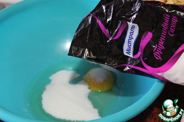В чашку разбиваем куриное яйцо. Насыпаем "Фруктовый сахар" ТМ "Мистраль". Перемешиваем.