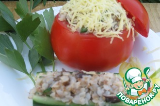 Овощи выложить на блюдо и сверху посыпать второй половиной сыра, зеленью.