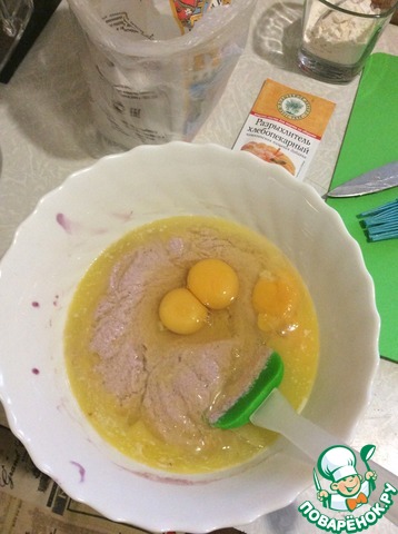 Далее добавляю яйца, муку и разрыхлитель для теста