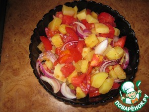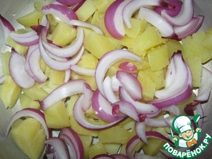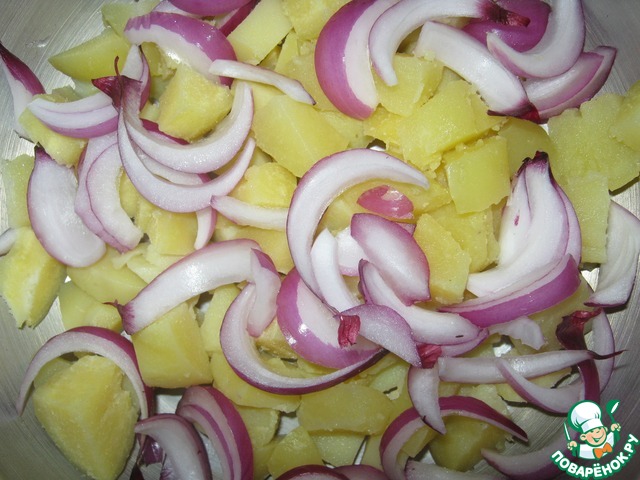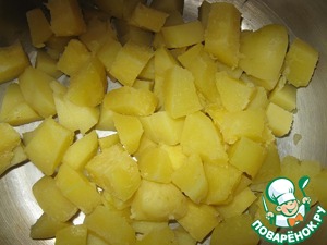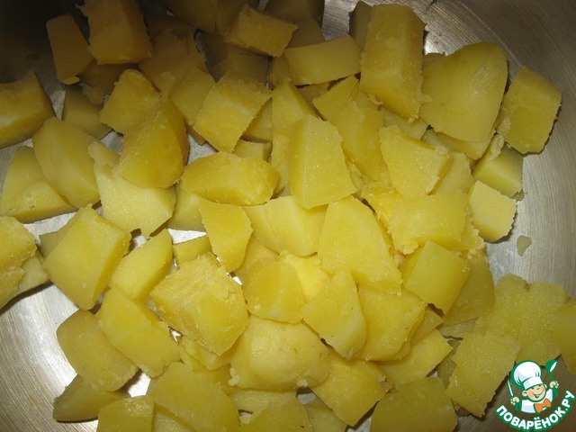 Картошку отварить в мундире, остудить, снять кожуру и нарезать крупными кубиками.