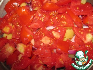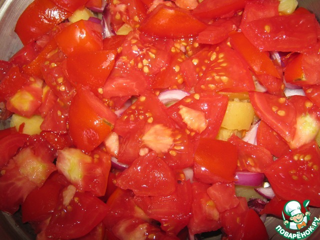 Все нарезанные продукты смешать, посыпать перцем, посолить, заправит маслом.
