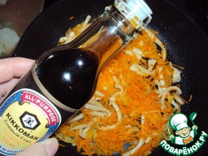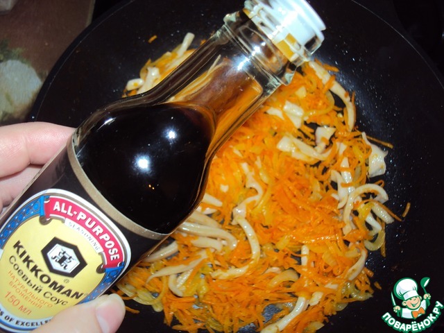 • Затем к кальмарам добавить овощи, соевый соус, специи, спассеровать все вместе еще минуту.