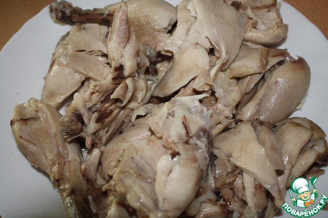 Свареную курицу разобрать на кусочки, я кожицу всегда снимаю. -