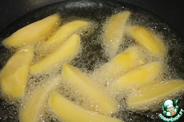 Тем временем раскаляем масло и обжариваем картофель до золотистого цвета.