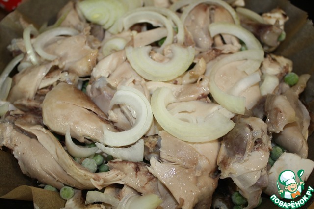 Укладываем кусочки курицы и сверху лук. Между всеми слоями чуток присаливайте, я брала свою ароматную ореховую соль.