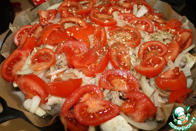 Затем наливаем бульон, он должен доходить до мясного слоя. Выкладываем помидоры и ставим запекаться в духовку на 45-50 минут при темп.200 град.