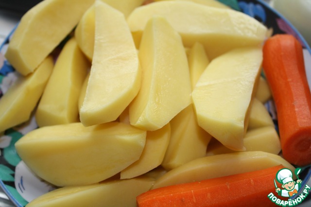Еще нам понадобится картофель и морковь. Картофель надо нарезать на крупные четверти, обмыть и обсушить. Жарить его надо сухим, так картофель впитает меньше масла.
