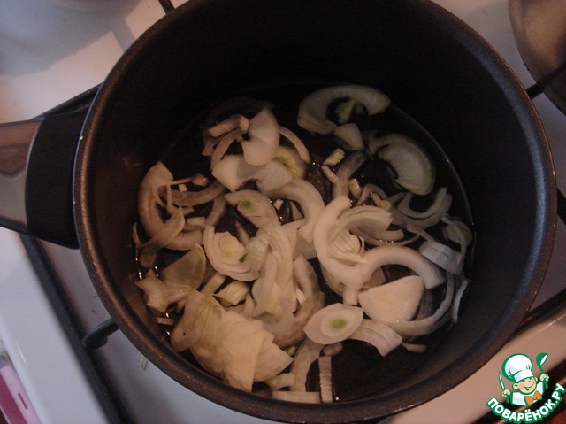 В сотейник налила масло, разогрела его и выложила лук, позолотила.