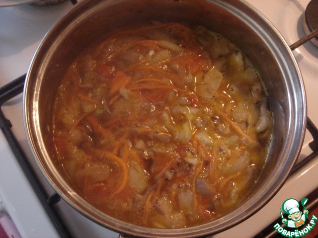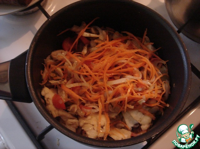 Далее выложила грибы, морковь и черри. Не обжаривала, а потомила почти до готовности.
