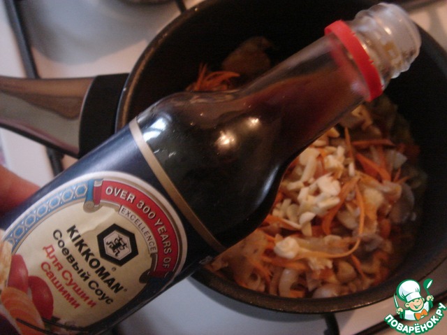 Добавила мелко рубленный чеснок и соевый соус. Перемешала и подержала на огне пару минут.