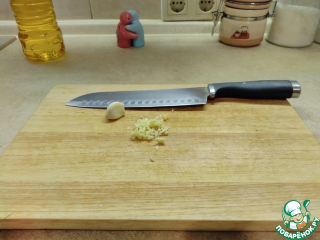 Измельчите мелко зубчики чеснока. Можно раздавить его в чеснокодавке