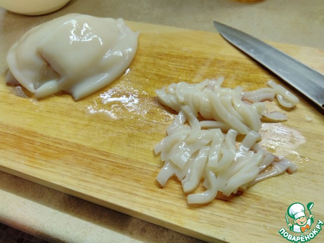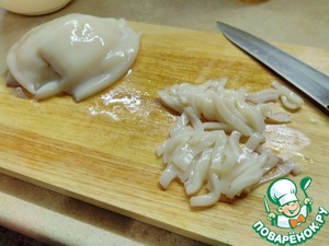 Сырые тушки кальмаров промойте, очистите от возможных остатков внутренностей. Чистые кальмары порежьте "брусочками" длиной не более 5 см