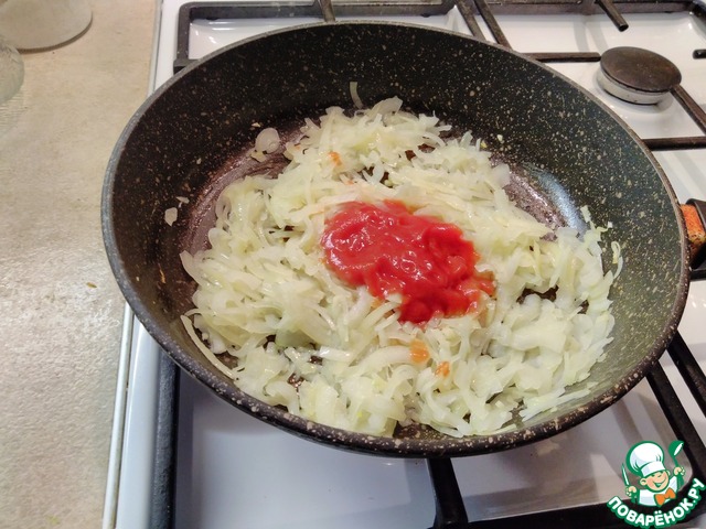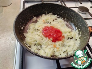 Когда лук станет чуть прозрачным, добавьте томатное пюре. Перемешайте и продолжайте готовить ещё минуты 3