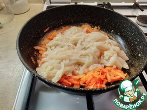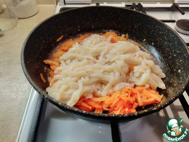 На этом этапе добавьте на сковороду кальмары, перемешайте и продолжайте готовить почти на максимальном огне. Лучше прикрыть сковороду крышкой, чтобы из кальмаров быстрее вышла влага