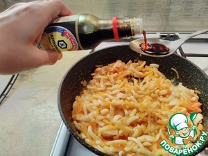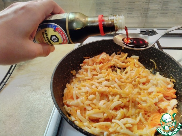Через несколько минут добавьте соевый соус, перемешайте, накройте сковороду опять крышкой и оставьте кальмары немного потомиться пару минут