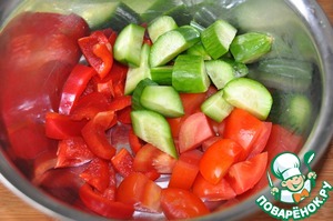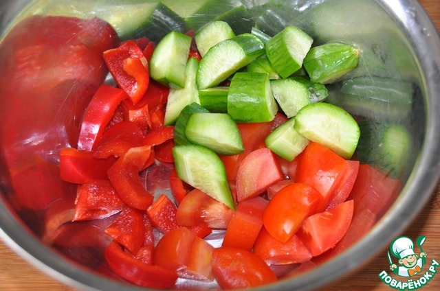 Берём болгарский перец, помидор, огурец и режем крупными кусочками.