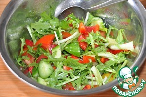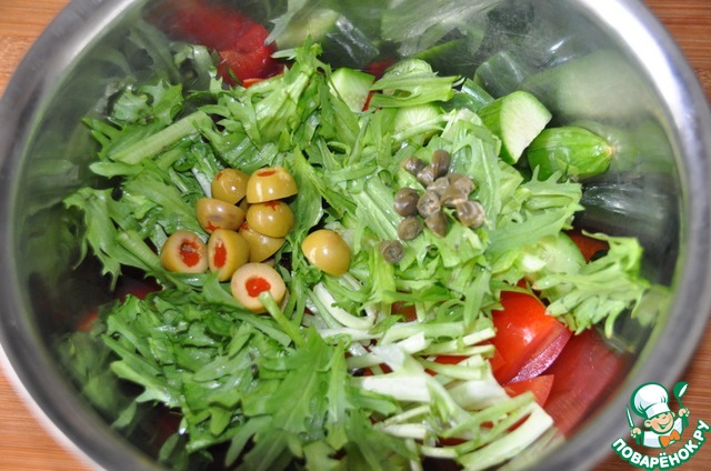 Рукколу моем, обсушиваем, режем, кладём в салат. Добавляем нарезанные пополам оливки или маслины и каперсы. У меня попались оливки с острым перцем.