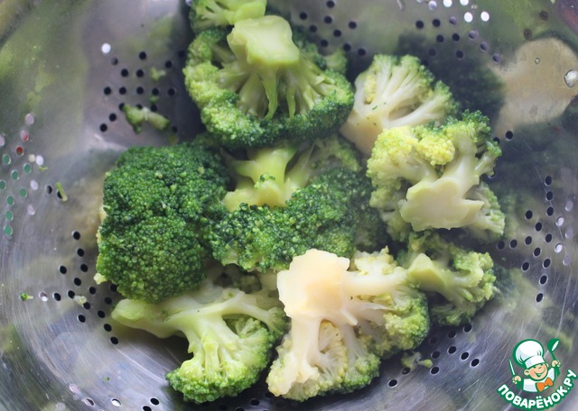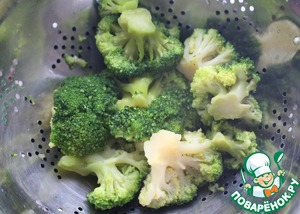 Если используете свежую брокколи, то срежьте соцветия и промойте под холодной водой. Если у Вас замороженный овощ, бросьте в кипящую подсоленную воду на 3 минуты. Брокколи должна оставаться твердоватой.