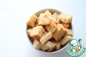 Батон нарезать кубиками, выложить на противень. Сбрызнуть 1 ч. л. оливкового масла, солью и гранулированным чесноком. Запечь при 180 градусах до золотистого цвета (минут 5).
