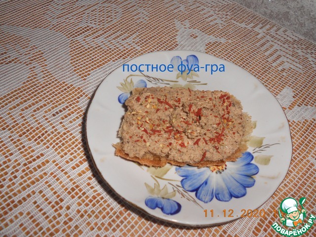Под таким названием я нашла этот рецепт на англоязычном сайте. Признаюсь, фуа-гра я никогда не пробовала, нот вот его постную версию приготовить решилась. Получился необыкновенно вкусный, нежный паштет. Никогда не догадаешься о том, что это исключительно постный рецепт, поскольку присутствует вкус печени. Замечательно подавать с крекерами, тостами (а можно и просто ложкой есть). Автор рецепта очень рекомендует подавать паштет с луковым мармеладом или маринованными овощами.