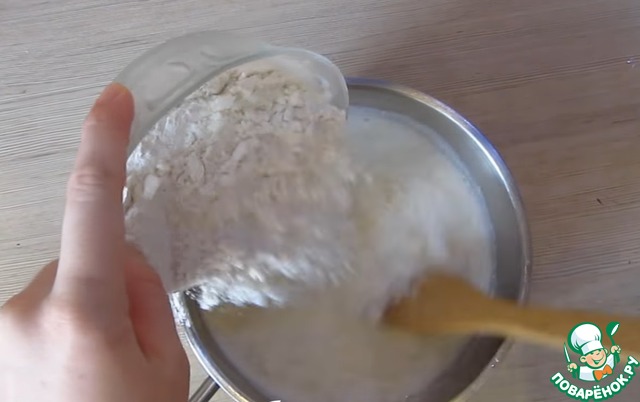 В горячее молоко засыпаем муку и тщательно перемешиваем деревянной ложкой.