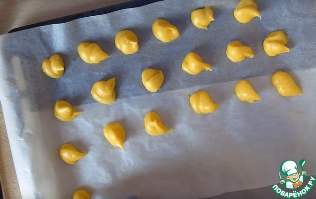 Чтобы испечь заварные шарики, переложите тесто в кондитерский мешок или пакет с затяжкой и отрежьте уголок диаметром 1 см. Можно выкладывать чайной ложкой. Шарики из теста нужно немного примять, чтобы хвостики не подгорели, их можно примять смоченным в воде пальцем.